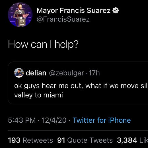 https://twitter.com/FrancisSuarez?ref_src=twsrc%5Etfw%7Ctwcamp%5Etweetembed%7Ctwterm%5E1335037068108554241%7Ctwgr%5Eb3c0674c3564a0e670490d9afbe644d963331090%7Ctwcon%5Es1_&ref_url=https%3A%2F%2Fthenetworkstate.com%2Fmiami